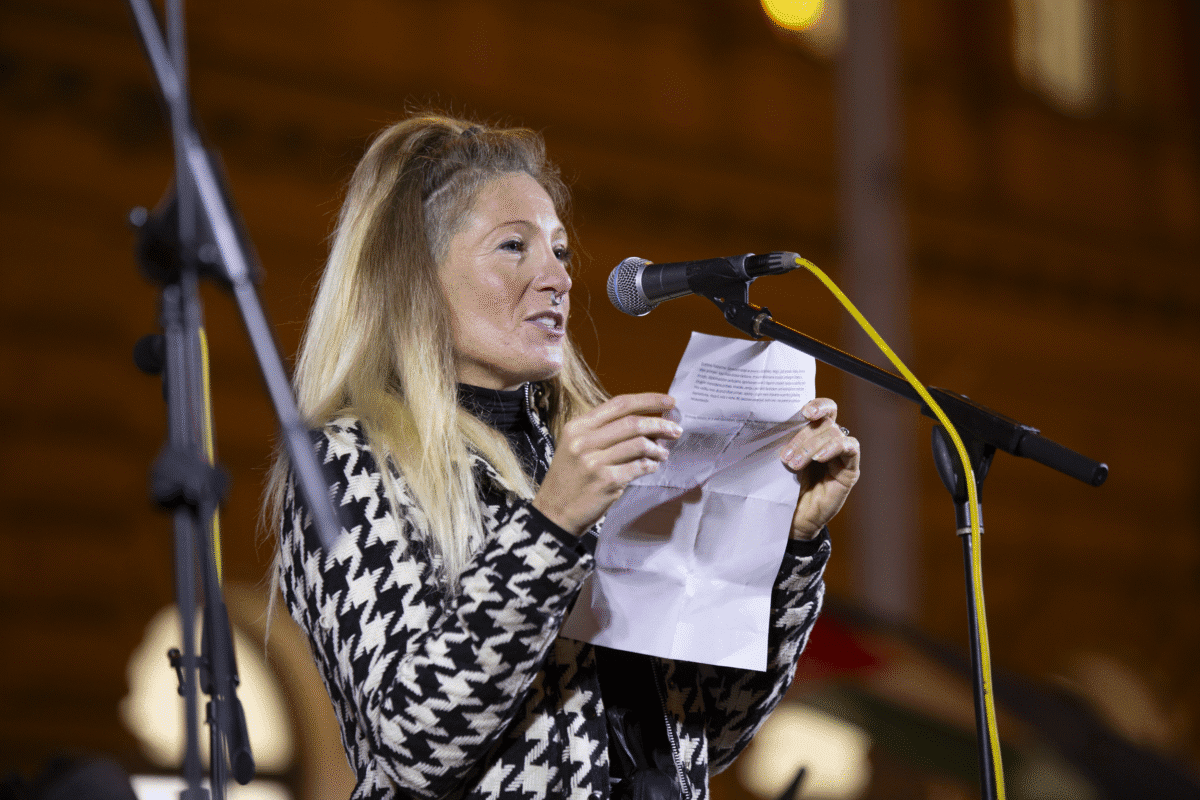 “Danas ću govoriti o flotili koja je plovila prema Palestini. O stotinama ljudi na 50 brodova i stotinama ljudi na kopnu, u pokretu. Ljudima od kojih većinu nisam stigla ni upoznati i s kojima sam se osjećala u čvrstom zajedništvu, raznježeno i moćno.