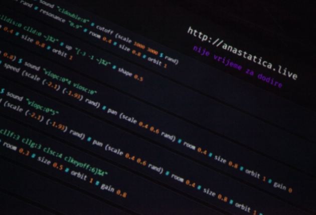 Anastatica je u spontanim periodima otvarala prostor za intervenciju publike u live izvedbu putem mobitela. Mogućnost sudjelovanja, inicijalno navedena u popratnom letku, tijekom izvedbe je komunicirana verbalnim uputama na platnu iznad koda: “nije vrijeme za dodire” ili “glazba= kod + dodir”. Poetična polisemnost uputa možda je referencirala vanjske okolnosti, korespondirajući od početka uspostavljenoj atmosferi distance. Prilikom ulaska u dvoranu, veći dio publike odvojio se od prijatelja i raspršio prostorijom, a to je, u kombinaciji s nedavno prizvanom sviješću o virusu, Anastaticu nehotice profiliralo kao samotno iskustvo obilježeno dvostrukom izolacijom – fizičkom distancom i udubljenošću u pokušaj konvencionalnog razumijevanja izvedbe.