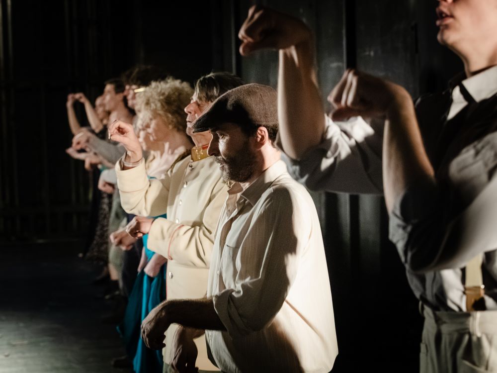 Ženski dio ansambla imao je pomalo nezahvalan zadatak, čini mi se. Glumice na sceni uglavnom šute, a ako imaju značajnije dijaloške dionice, tumače muške uloge (primjerice, Anđela Ramljak, Dora Polić Vitez i Petra Svrtan kao arsenalski radnici). Dakako, one toliko upadljivo šute da je njihova sveprisutnost očito komentar na nijemost ženskih glasova u ratnim vremenima, ali i u Logoru i Golgoti, u kojima su potpuno marginalne, poput Kristijanove žene u Golgoti (Iva Kraljević). One uglavnom tumače više likova od muškaraca, a neki od tih likova tek su žene koje se spominju, ali ne pojavljuju u Krležinim dramama, poput mrtve učiteljice u Logoru (Polić Vitez). Iako ova feministička intervencija funkcionira, ona staje na prvom koraku jer se nijedan od ženskih likova ne uspijeva dovoljno temeljito razraditi da bi izazvao bilo kakvu emocionalnu reakciju.
