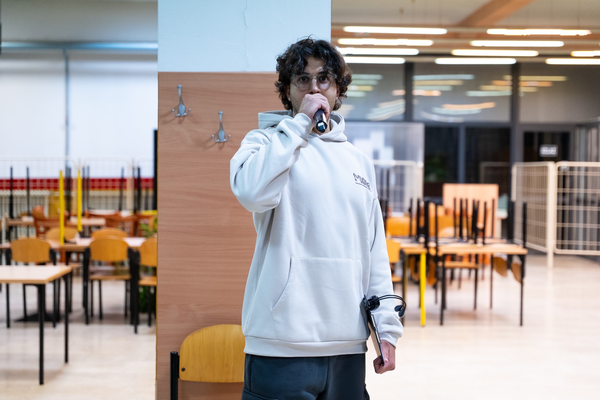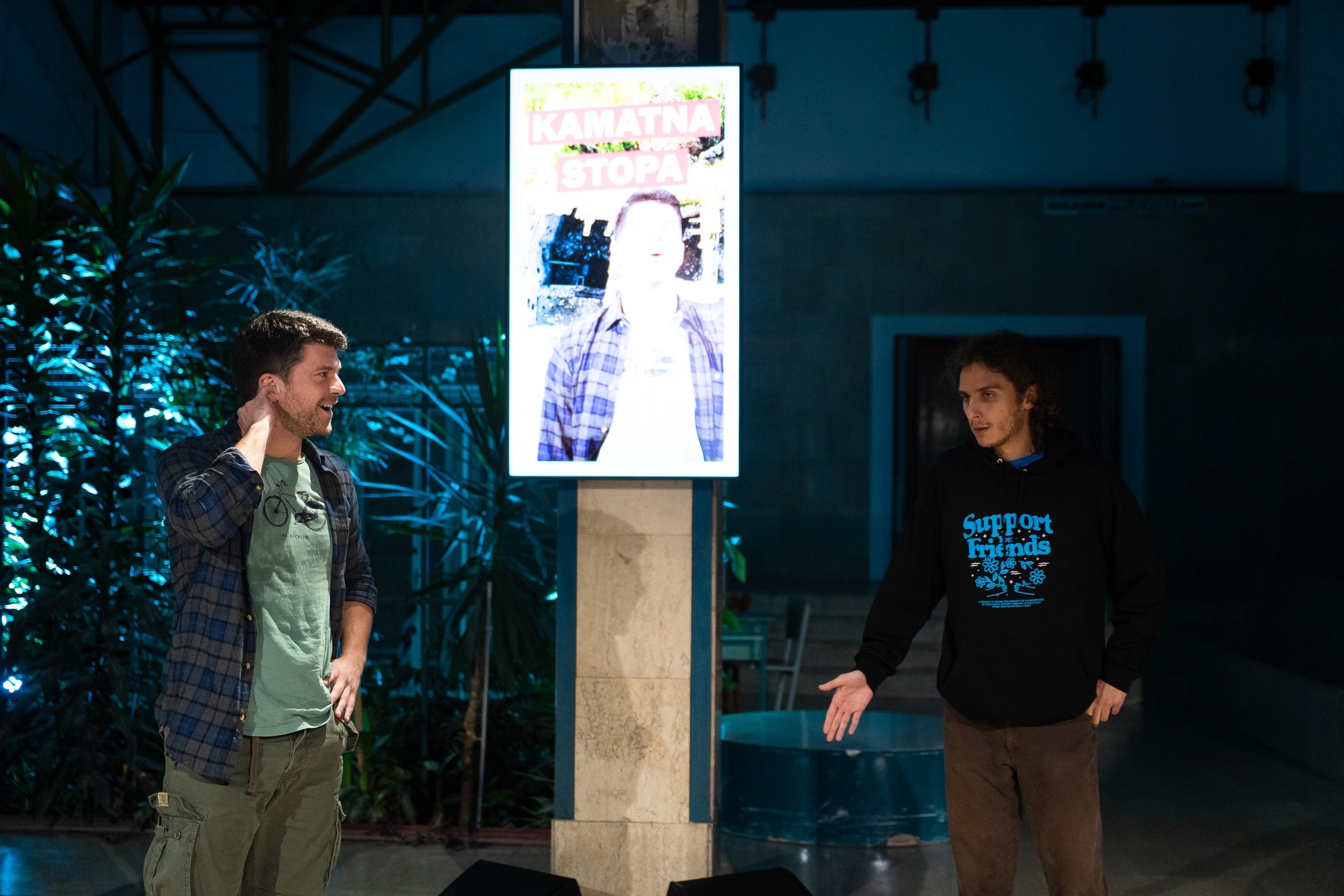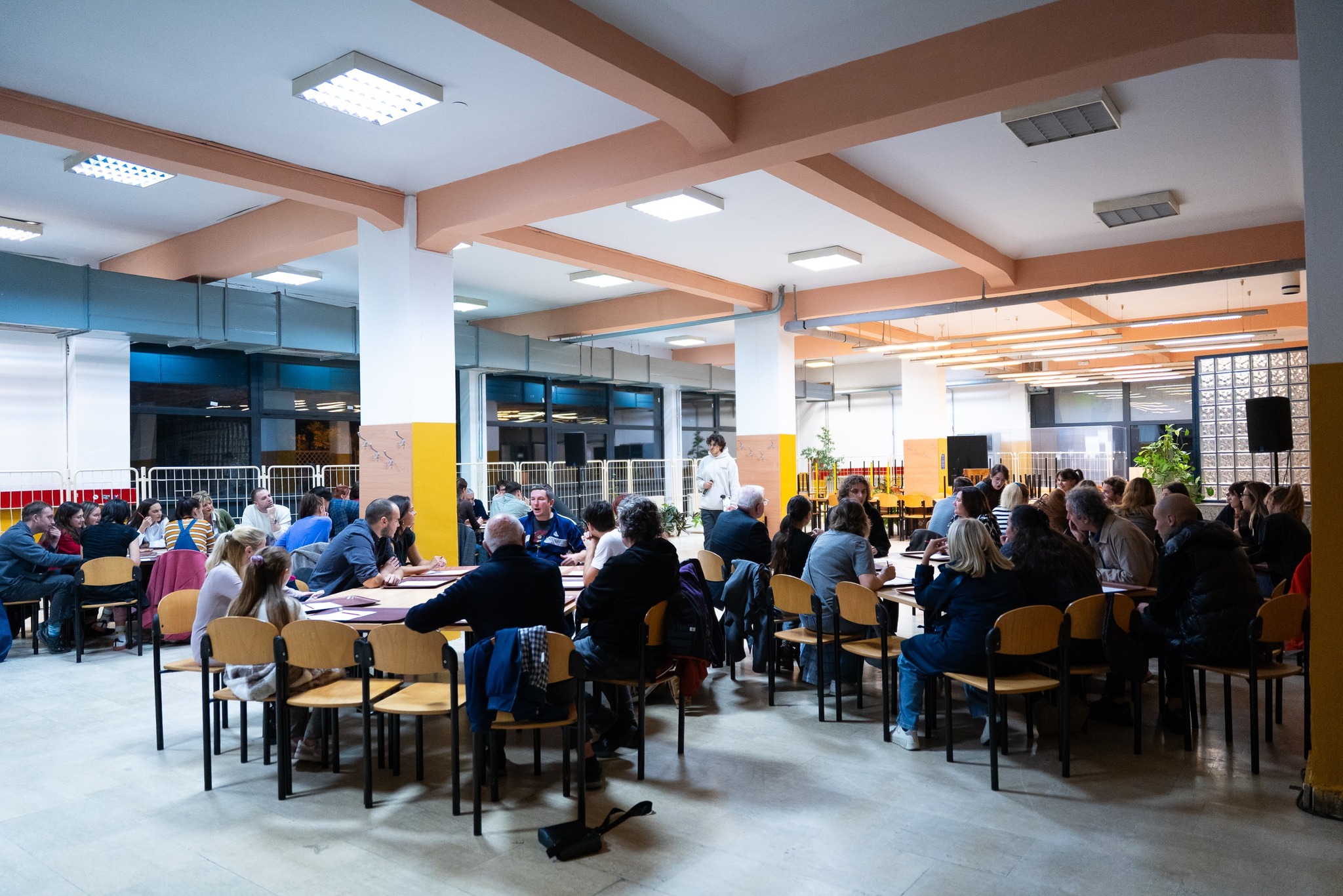 Hostese vode publiku kroz hodnik glavne zgrade Studentskog centra u Savskoj gdje se nalaze “brza” i “spora” menza te stepenište koje vodi prema Student servisu. Hodamo prema “sporoj” menzi, najgoroj menzi po mom sudu, i ulazimo redom u restoran gdje nas čeka petero glumaca (Nika Ivančić, Ivan Magud, Lav Novosel, Kristijan Petelin i Jakov Zovko), svaki za svojim stolom. Glumci drže papir s nazivima grupa za pub kviz i pokušavaju nas pridobiti u ekipe.