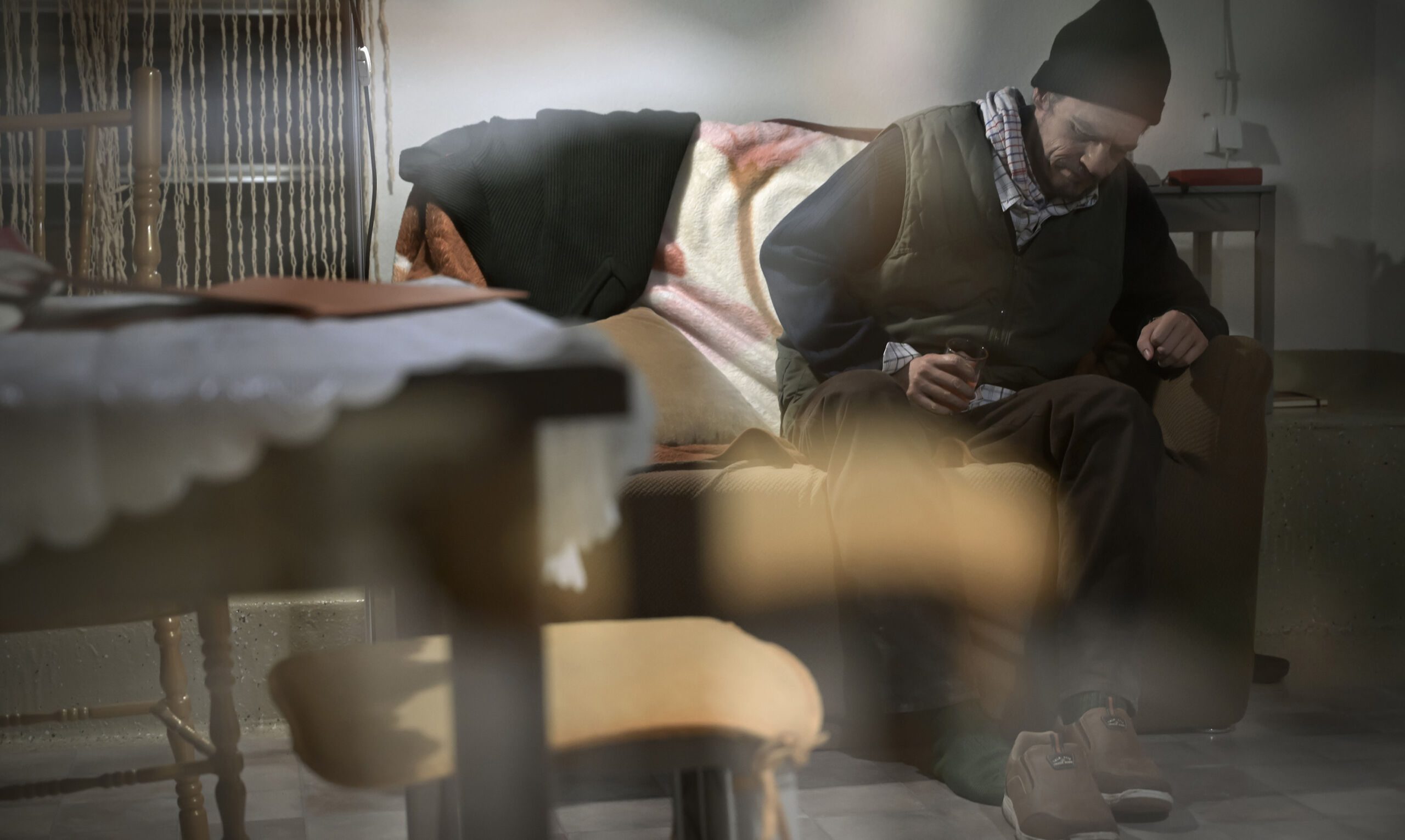 Umjesto u uobičajenu kazališnu dvoranu u kojoj je prostor tako grubo odvojen na pozornicu i gledalište, zajedno s petnaestak drugih ljudi ulazim u malu prostoriju koja više nalikuje nečijem skučenom stanu nego mjestu izvedbe. Prostorija skromne kvadrature sastoji se od kutka koji tek nalikuje na kuhinju i malog stola smještenog na jednoj strani sobe, dok na drugoj stoji staromodni kauč prekriven onom prepoznatljivom debelom dekom kakvu zasigurno svačija baka čuva u svom ormaru pod tankim slojem prašine.