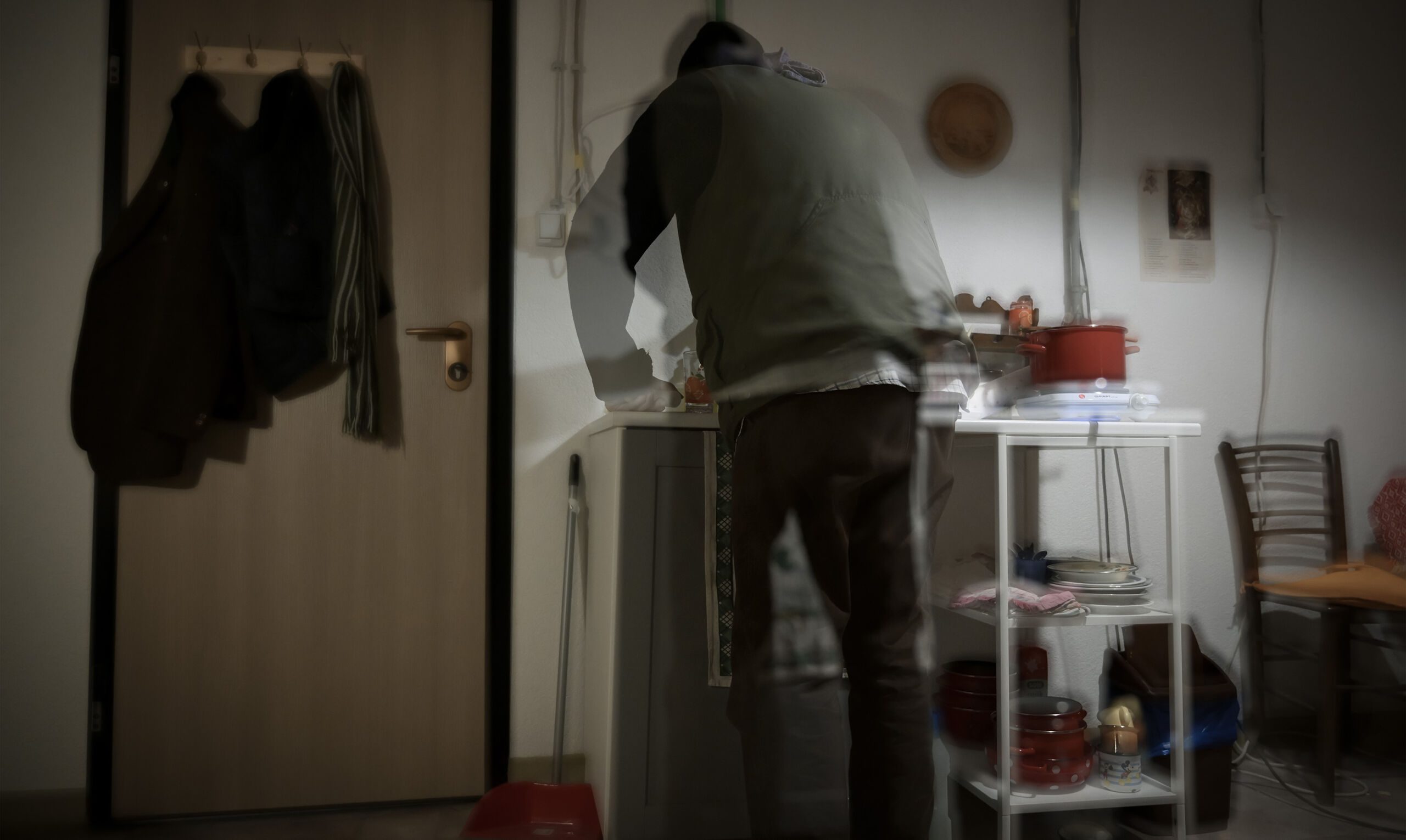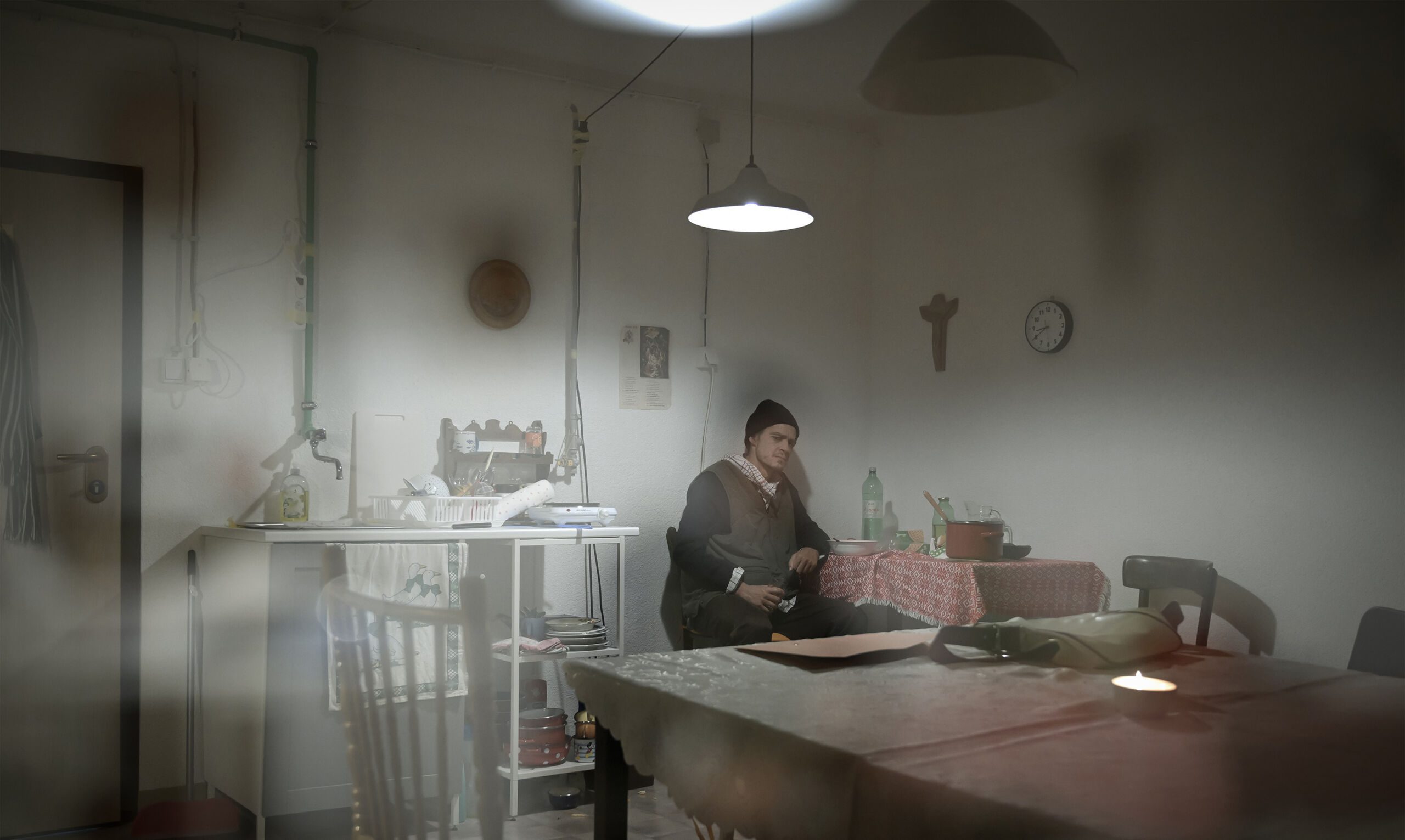 Dok se prostorija lagano popunjava, prostor oko mene poprima sve više detalja – bijele ogoljene zidove krase kablovi, prekidači i cijevi. Iznad kuhinjske površine na zidu visi smećkasti tanjur, a s desne strane raspelo i sat. U kutu je radio iz kojeg muklo svira meni nepoznata božićna pjesma, poprilično loša, ali upravo zato nekako savršeno pogođena. U ovakvom prostoru njezina je svrha tek da nadglasa tišinu koja stalno prijeti da postane preglasna. Isprva oprezna i tiha, publika se s vremenom opušta i gotovo postaje dijelom same scenografije, a prostorijom počinju kružiti nježni, prijateljski razgovori.