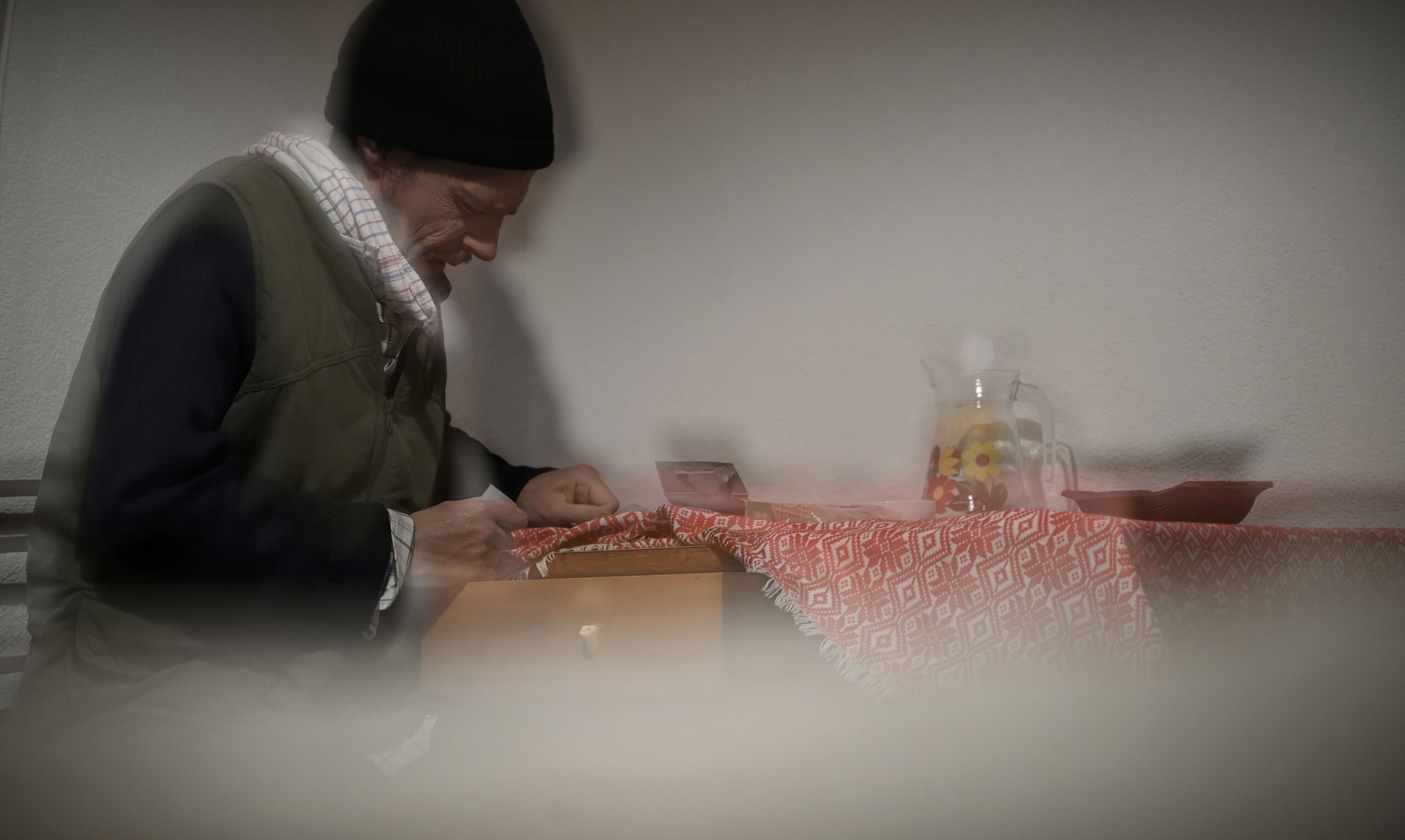 Sjedimo zajedno s glumcem i postajemo dijelom pripovijedanja, suigrači u javnoj izvedbi i u fiktivnom svijetu lika. Starac s nama dijeli stare priče i viceve, nudi nas domaćim špekom, gemištom i keksima, koje sada bez zadrške prihvaćamo. Postupno preuzimamo i male domaćinske geste, režemo, točimo, dodajemo onima pokraj sebe i iza sebe, pa se kroz te sitne činove zajedničkog sudjelovanja otvaramo jedni prema drugima, razmjenjujući iskustvo na neočekivano intiman način. Predstava sada kao da iznova nastaje u zajedničkom prostoru, onome između svakog od nas, a interakcija postaje srž izvedbe.