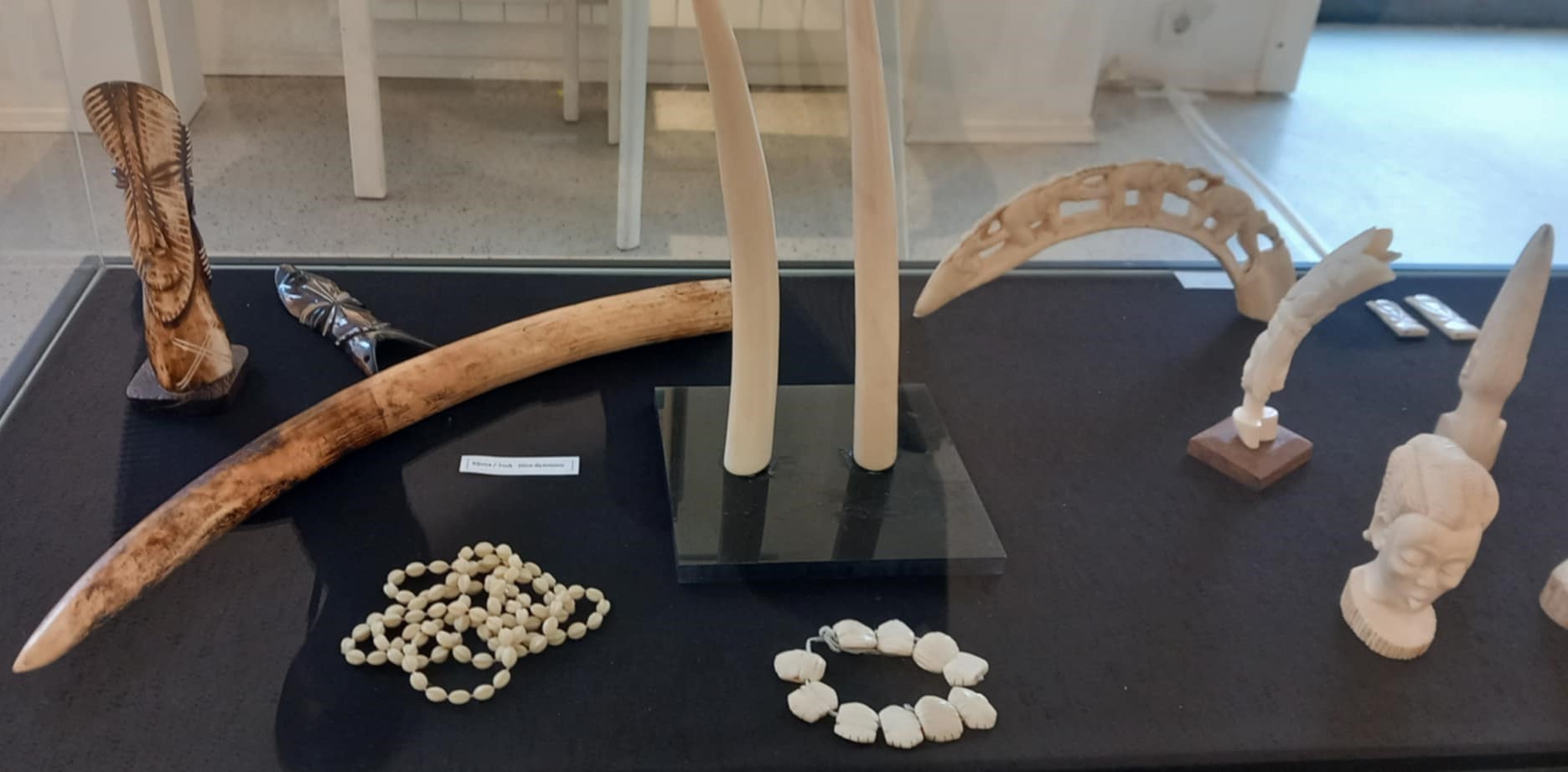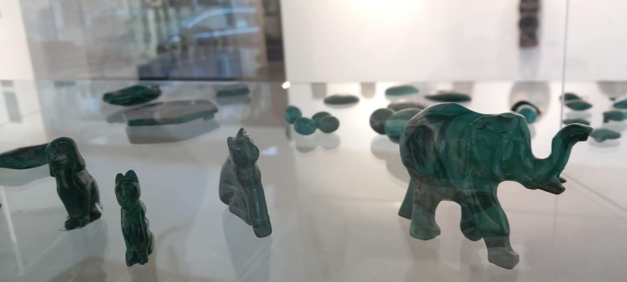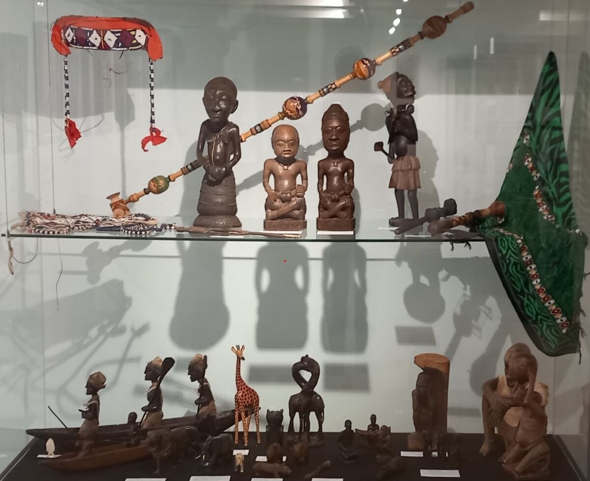 Proizvedenost mnogih predmeta za senzibilitete Europljana (pa tako i misionara) u ovoj izložbi osobito je vidljiva u jednoj vitrini koju sam izostavio iz uvodnog pregleda: u staklu, između drvenih obrisa Afrike i maski, ispod ovješene zmijske kože, kolekcija je ukrasnih predmeta, tričarija zapravo, izrađenih od malahita i slonovače: rezači za pisma, set za šah, figurinice pasa, lavova, mačaka, ukrasne skulpture, sijaset malih malahitnih privjesaka u obliku križa, mala kolekcija dragog i poludragog kamenja popraćena rukom pisanim pojašnjenjima svakog kamena na francuskom jeziku. U kontekstu izložbe ovi predmeti najeksplicitnije podsjećaju na nasilnu i okrutnu eksploataciju ljudi i prirodnih resursa za europska tržišta, zajedno s legendom za bič od kože nilskog konja kojom su, kako eksplicira, kolonizatori kažnjavali podanike. I dok predmeti poput oružja, ceremonijalnih mačeva, ritualnih maski, predmeta iz svakodnevnog života, pojedinih statua, vrlo lako mogu poslužiti u konstrukciji imaginarija primitivne Afrike i “tradicije”, ovi predmeti svom silinom dovode pred posjetitelje modernu Afriku.