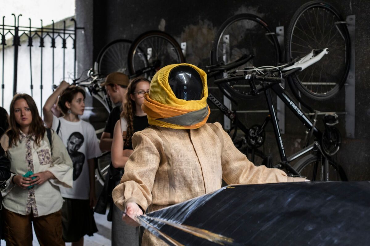 Zbivao se u haustoru ispred ulaza u stan i kad sam došao stvar je već bila dobrano počela, no ubrzo sam shvatio da su trenuci dolaska i odlaska mogli biti potpuno po volji posjetitelja, jer su umjetnice ogroman, duguljasti pravokutni komad reflektirajućeg elastičnog materijala tresle kao što se plahte ili deke tresu od prašine, čineći to bez prekida ili vidljivih promjena. Od glave do pete bile su odjevene u jutene kombinezone, dok su na glavama nosile kacige nalik astronautskima ili onima od pretpotopnih ronioca iz ranih znanstveno-fantastičnih stripova i ilustracija. Tako su, i prije ulaska u interijer izložbe, za nas posjetitelje performansa postavile njezin narativni karakter, otvoren različitim interpretacijama.