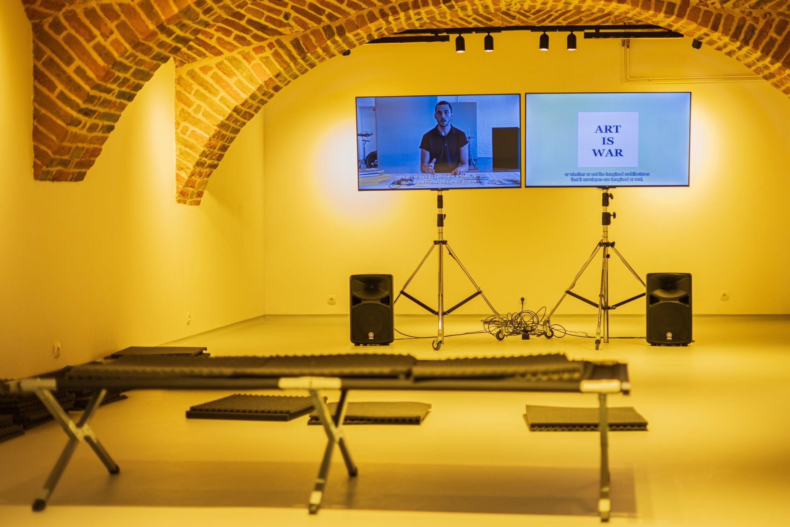 Potreseni, imamo opciju skrenuti desno, u prostorije koje sadrže niz dokumentarnih filmova o Vojinu Bakiću uključujući i film o rušenju spomenika NOB-a Udar na sjećanje / Damnatio Memoriae redatelja Bogdana Žižića. S lijeve strane čeka nas suvremeni rad Miloša Trakilovića, All But War Is Simulation. Trakilovićev video rad okružen je žutim svjetlom koje bliješti i zaslijepljuje nas dok ulazimo i sjedamo u podrumsku prostoriju.
