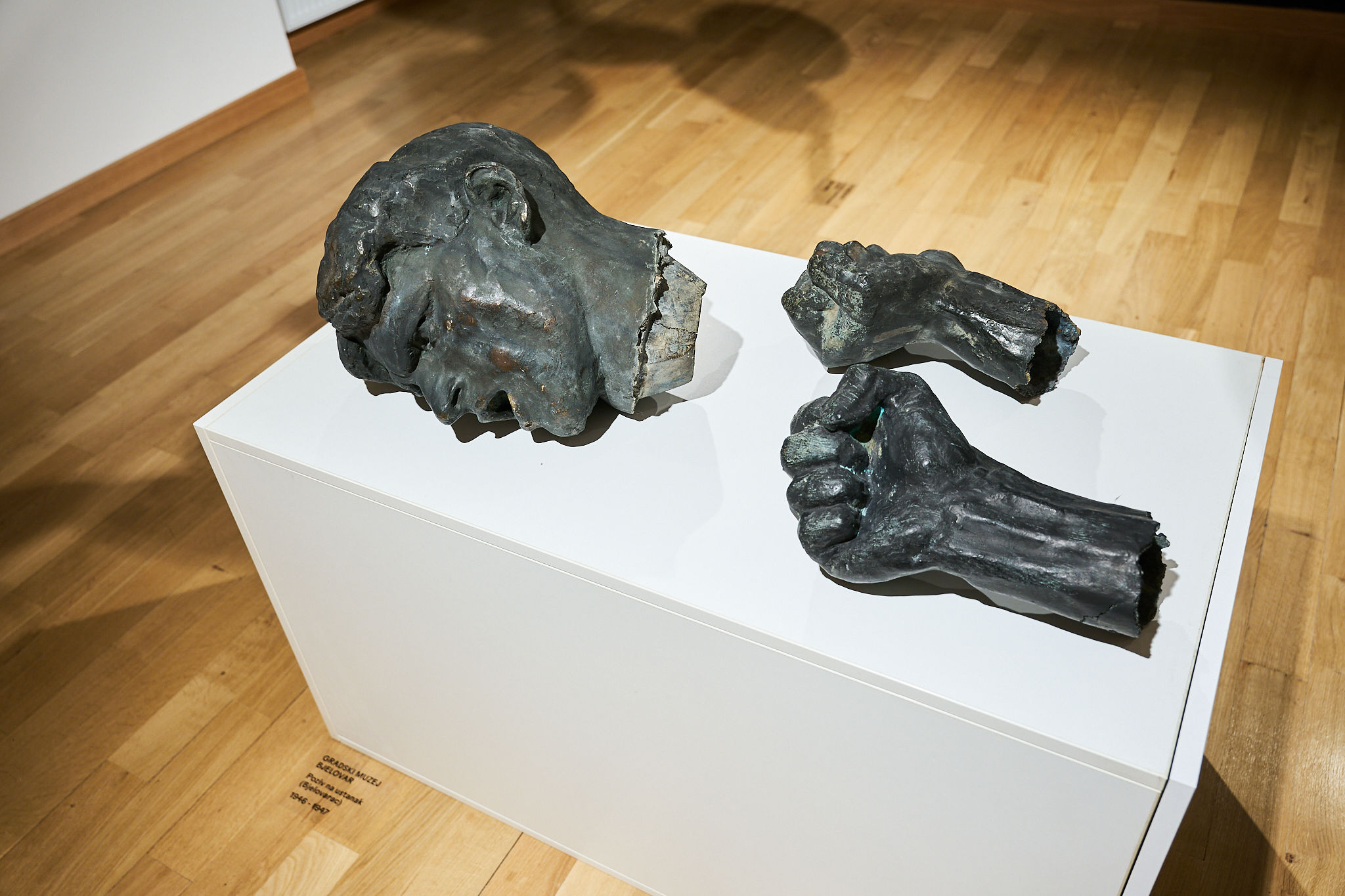 Čak i ako ne primijetimo te suptilne intervencije, prolazak kroz prvih nekoliko soba naglo prekida prizor ostataka Bjelovarca, dramatičnog spomenika ustanku u Bjelovaru i jednog od najranijih primjera socrealističke spomeničke plastike. Bjelovarac je miniran i uništen 1991., a dramatičnom prizoru spašenih fragmenata – dvije šake i glave revolucionara – dodatno pridonosi jedna viseća Svjetlosna forma. Kao i u ostatku izložbe, pozvani smo da se s ovim trenutkom suočimo sami, bez pomoći teksta na zidu koji bi nam objasnio što gledamo. Bjelovarac je rekonstruiran i ponovno postavljen u Spomen-parku Borik 2010. godine, ali njegovi ostaci osvijetljeni refleksijom Svjetlosne forme, podsjećaju nas da taj čin uništenja zauvijek ostaje njegov integralni dio.