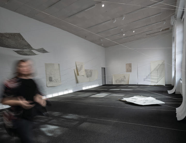 Rad je u prostoru povezan nizom elastičnih niti “postavljenih na nejednakim visinama i razvučenih u različitim smjerovima tako da čine isprepletenu mrežu linija. U prazne sekvence međuprostora postavljeni su crteži, figurativni prizori, detalji iz autoričina doma izraženi u olovci na papiru.