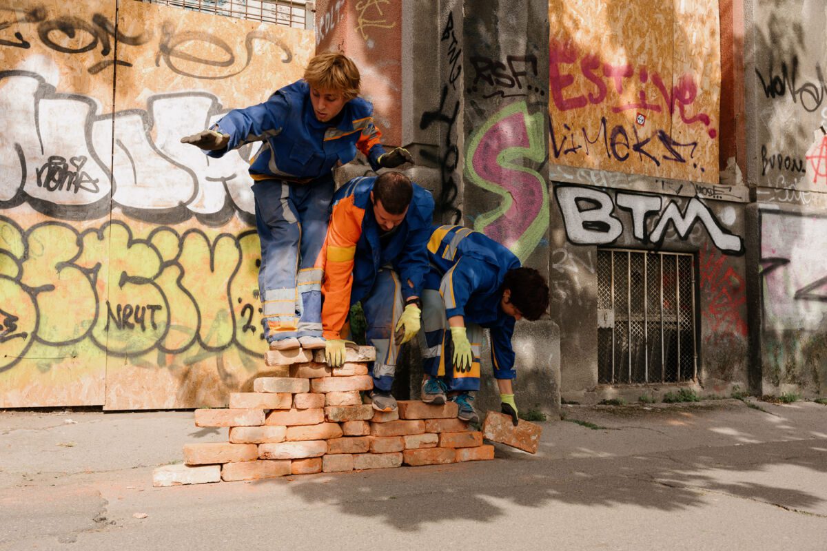 “Koristeći upečatljive objekte s gradilišta kao mjesta mjerljivog rada, nastojimo umjetnički rad učiniti vidljivim kako bismo istaknuli društvenu ulogu umjetnosti i umjetnika”, pojašnjava popratni tekst izložbe realizirane u hibridnom formatu koji uključuje fotografije, video, akcije i performans. “Na kraju s dozom humora, ali i ironije, postavljamo pitanje – koliko je umjetnika i umjetnica potrebno da se izgradi Dom mladih? I nisu li ga upravo oni sagradili?”, zaključuje u popratnom tekstu kustosica izložbe Tena Starčević.