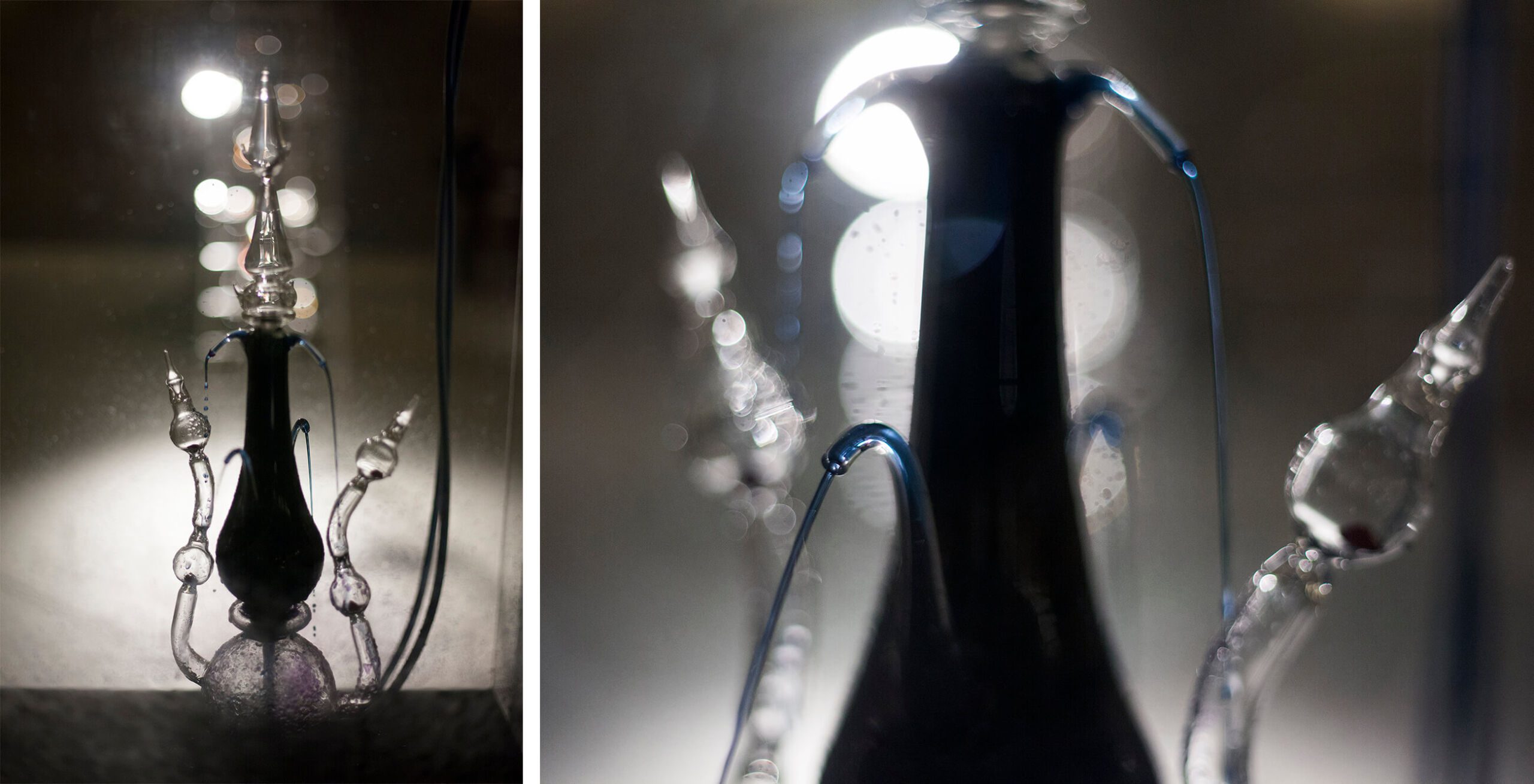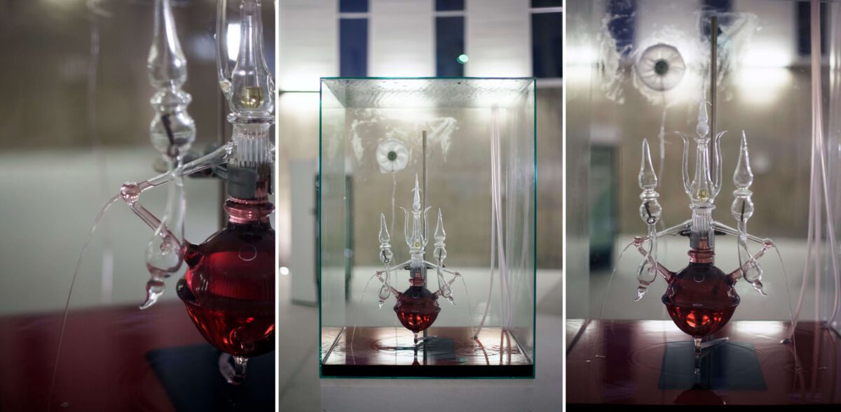 Kako pojašnjava povjesničarka umjetnosti Sanja Cvetnić u tekstu koji prati izložbu, “dvije fontane Silvija Vujičića sastavljene su od odvojenih ovojnica od puhanoga borosilikatnoga stakla – što ih čini otpornim na visoke temperature – montiranih tako da oblikuju razvijeni obris, vertikalan, s ‘izbojcima’, poput gotičkih relikvijara. Staklene cijevi krvotoka fontanā odvojeni su sustav od ampula na vrhu i na krajevima. Protočni dio fontana ovisan je o mehanizmima – ‘srcu’ motora i ‘plućima’ ventilatora – a u ‘ukrasne’ staklene i prozirne tornjiće nalik fijalama na gotičkim crkvama upuhane su sjemenke ili su pak u njima druge (s)tvari ili tekućine koje ne kolaju pa su ti dijelovi u ulozi ampula.”
