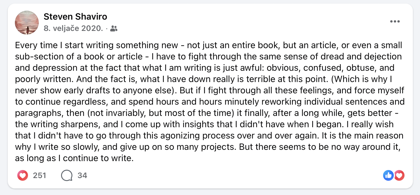 Na sreću, ima i onih koji govore o tome koliko se muče u procesu stvaranja. Evo što na primjer kaže filozof i kritičar Steven Shaviro: