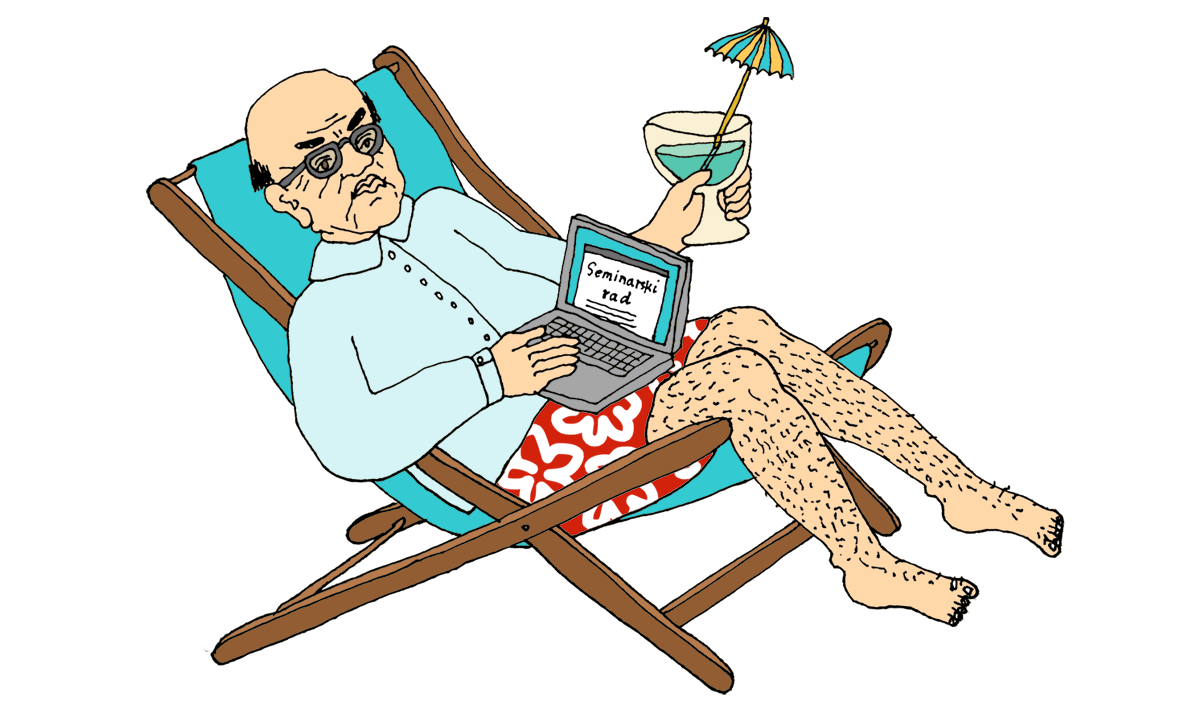 A ti, bez njegovog kvocanja, napiši seminar koji ne ide previše u širinu, ima neku jasnu i jednostavnu tezu, uvod, sredinu, zaključak, popis literature, i gotovo. Svi znamo kome će biti zabavnije. Ako ti ne bude išlo, samo baci pogled na naslovnu ilustraciju Ene Jurov koja o snobovima na plaži govori više od tisuću riječi. <3