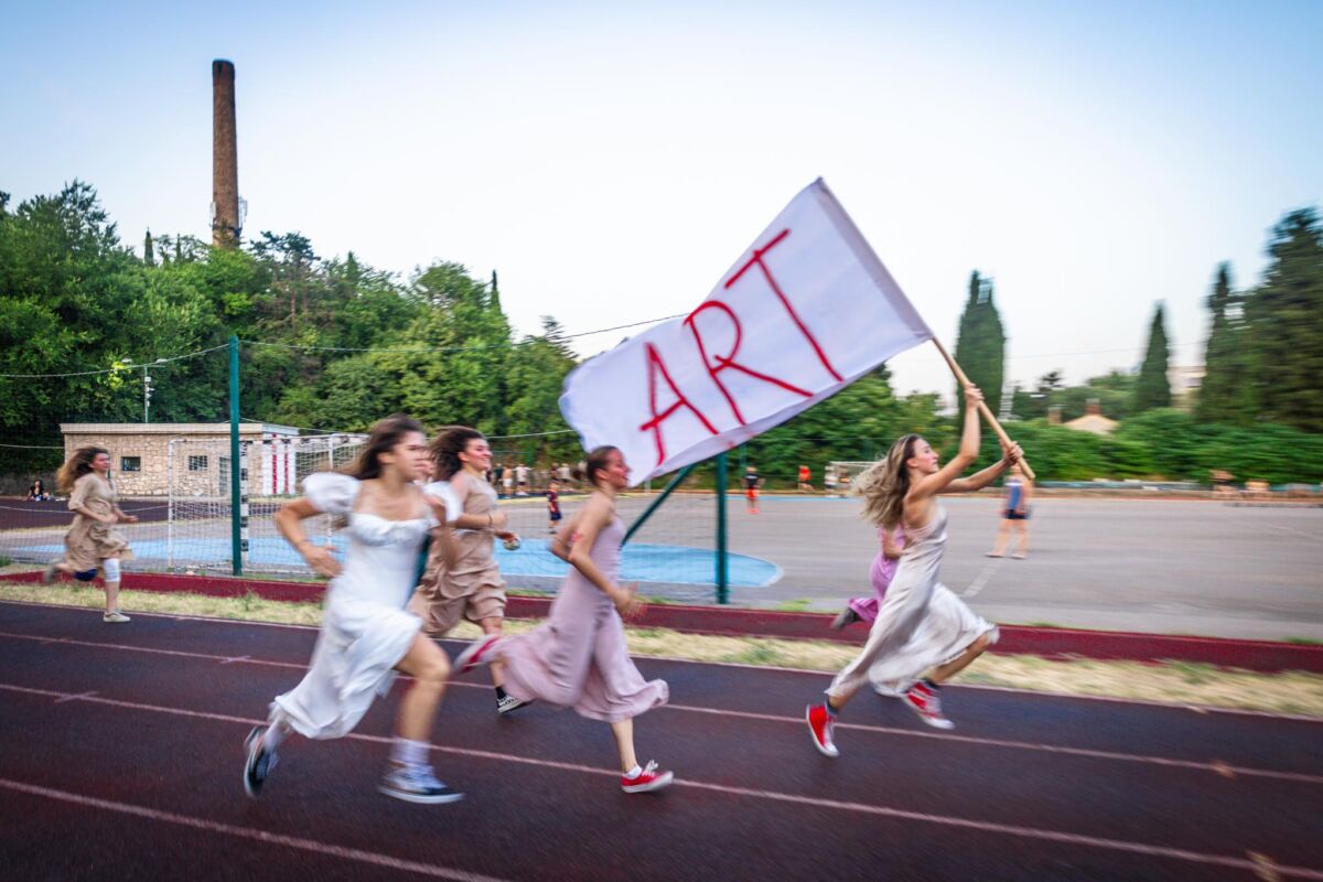 Art, a ne rat izvedba zamišljena je kao koreografsko promišljanje prostora obilježenog poviješću poslušnosti, kontrole i kolektivne tjelesnosti. Kao aktivnog sudionika i svojevrsni arhiv koristi nekoć Vojno, a danas Otvoreno igralište Kampus na Trsatu u Rijeci. Ispitna produkcija nastala je suradnjom Akademije primijenjenih umjetnosti (APURI) i HNK-a Ivana pl. Zajca u okviru ovogodišnjih Riječkih ljetnih noći, a u srijedu, 2. srpnja, pred stotinjak gledatelja izveli su je studentice i studenti treće godine studija Gluma i mediji: Ernest Belošević, Sara Bunić, Tonka Bušić, Tea Sekelj, Zoja Sirovec, Mare Šimić, Karla Šoštarić, Matea Tkalčević i Mateo Zvono.