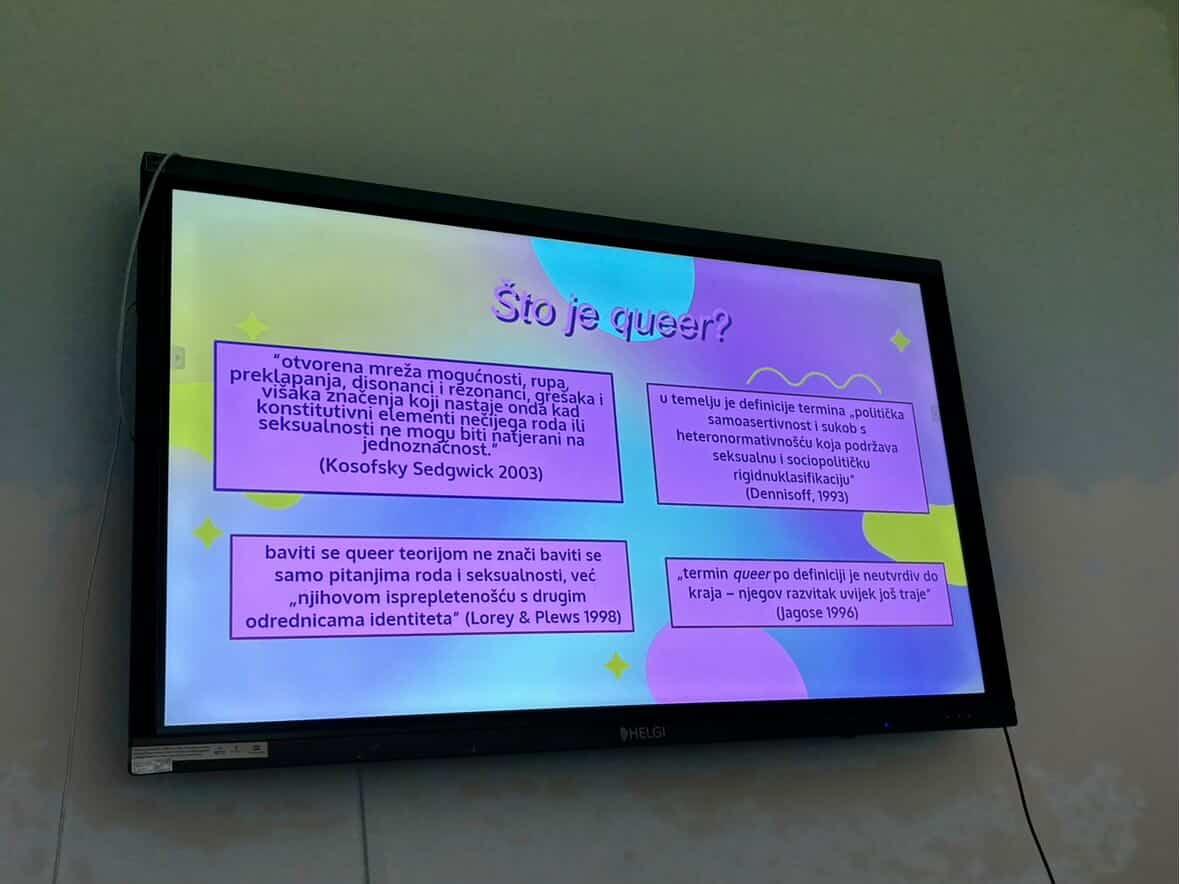 Predavanje doktorandice završava Ahmedinim terminom “happy queer, happily queer” i razgovorom o turbofolku. Prema Ahmed, ono što nazivamo “queer srećom” često nije spontano ili individualno iskustvo, nego društveno oblikovan ideal: queer osobe potiče se da budu sretne na način koji je već definiran unutar heteronormativnog poretka. Drugim riječima, sreća se ne prepoznaje kao nešto što osoba sama određuje, nego kao nešto što joj se implicitno pripisuje.