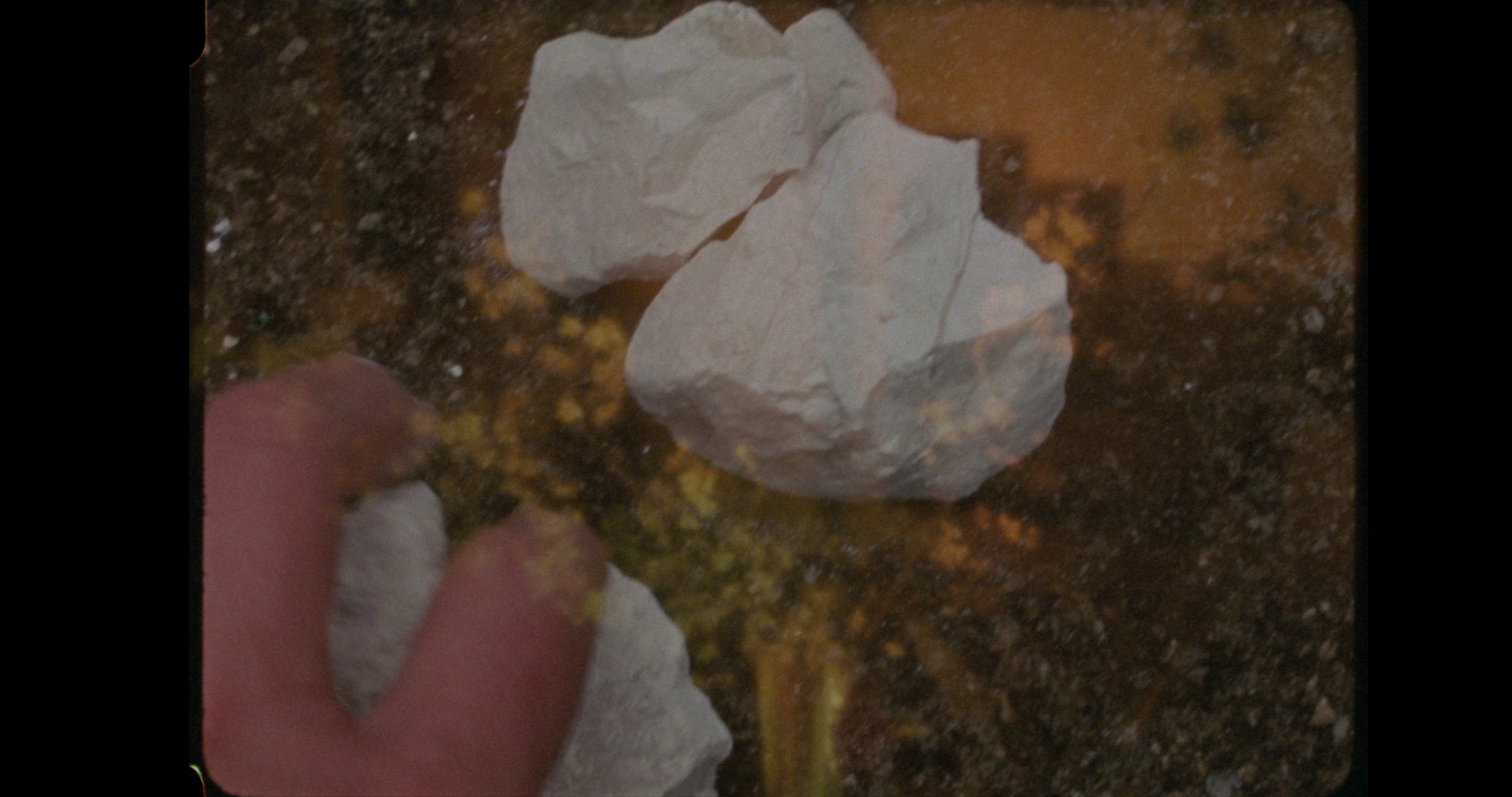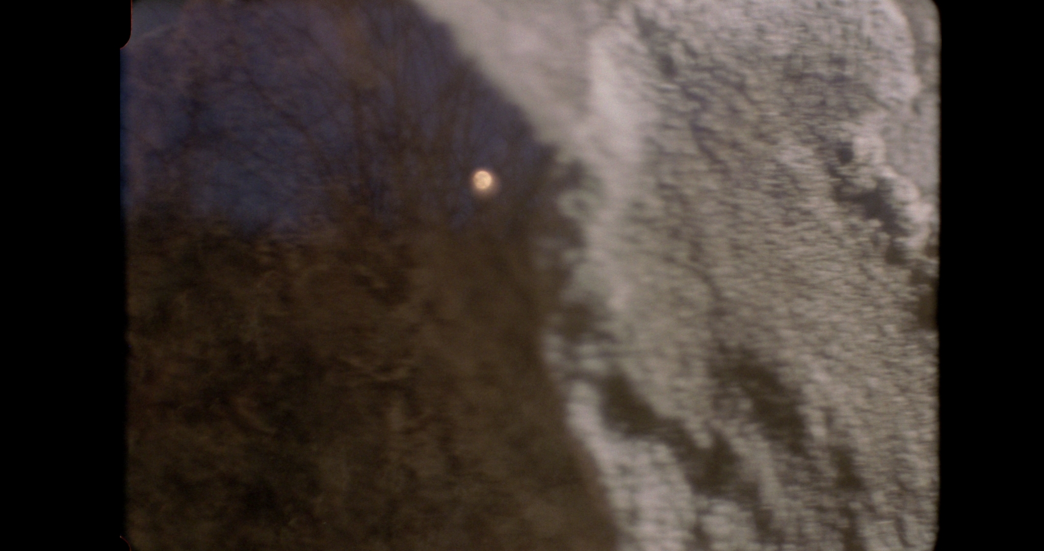 6:48–8:31. Speleološka sekvenca? Ili samo tisuću puta uvećani kristali soli (Hey & Walters, već prenamjenjivani za ITC scenu)? Možda nešto što se zbiva u drugačijim mikroprostorima (“cement između zuba i kosti”), intimna telurska konverzacija s materijalima u kojima plivamo dok postojimo? Dezorijentira me zvuk, sjajna montaža (Ivan Zelić), elektropuls koji, osobito na prvo gledanje, posve mijenja i karakter vizualnog signala: čestice kristala u tamnom prostoru pretvaraju se u scintilaciju zvijezda, divlje noćno nebo.